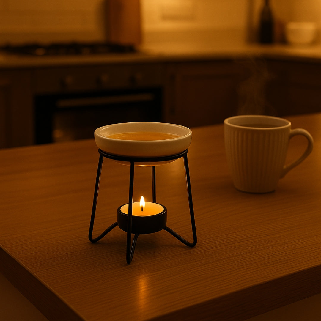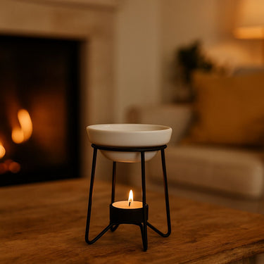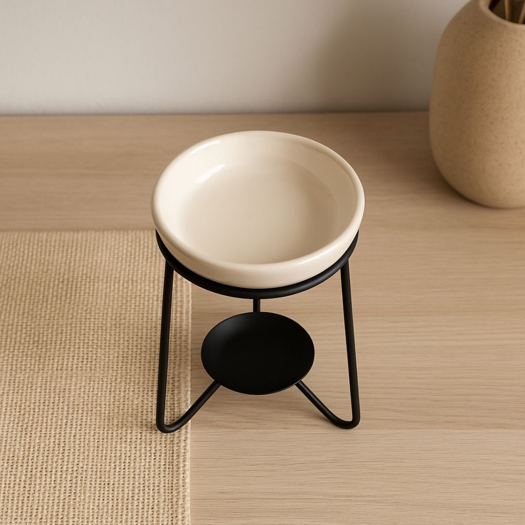 Add a modern touch to your home fragrance ritual with our Ceramic Dish Wax Melt Burner. This contemporary piece pairs a sleek black metal stand with a smooth white ceramic dish, creating a refined balance of warmth and simplicity.